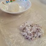 お皿の上にラップを敷き、その上でおにぎりを作りました